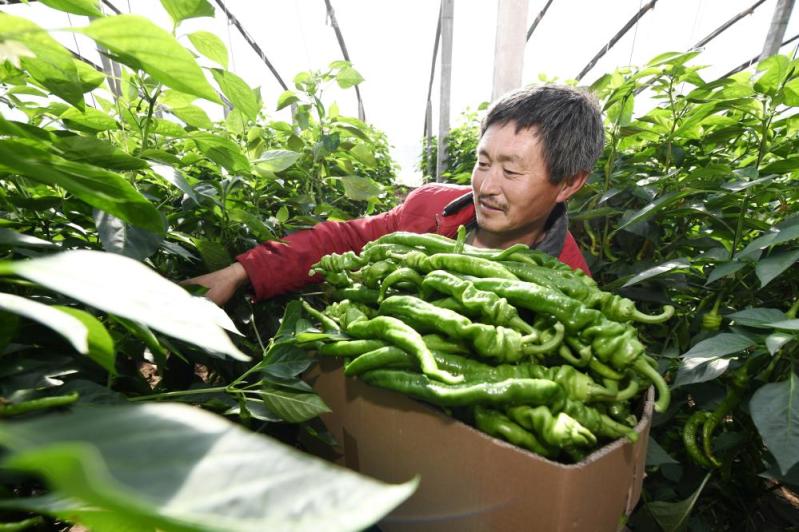 2018年12月9日,河北乐亭胡家坨镇一个果蔬专科调解社的社员在大棚内采摘辣椒。