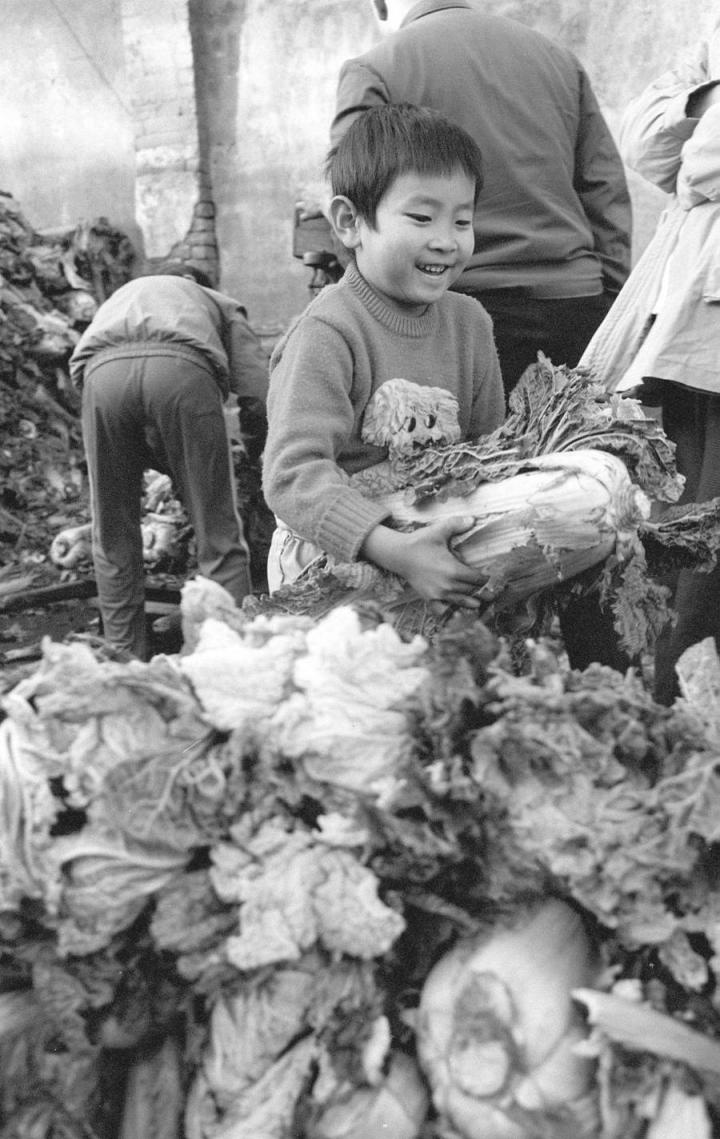 1988年11月,别称儿童在北京一个冬储菜售卖点匡助大东说念主搬白菜。