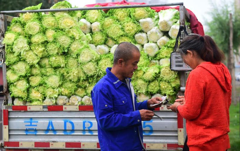 2016年10月3日,在吉林长春民丰大街农产物批发阛阓,菜农(左)在售卖大白菜。