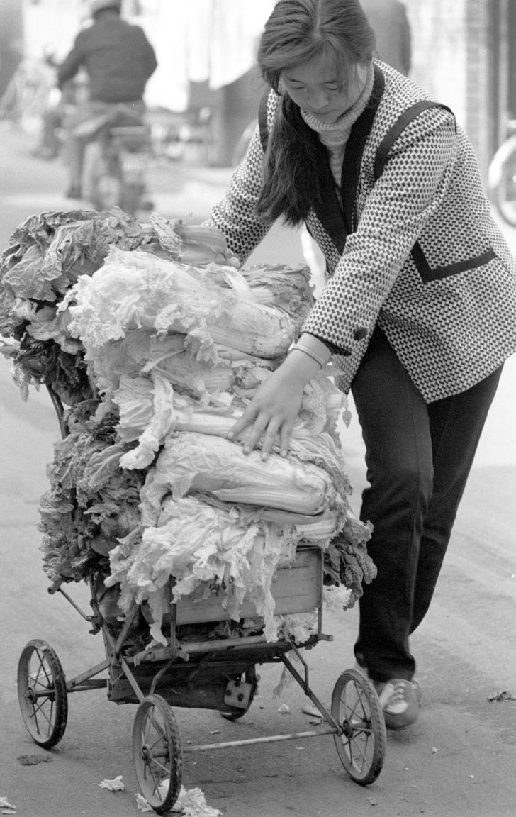1988年11月,北京街头一位女士用婴儿车运送白菜。
