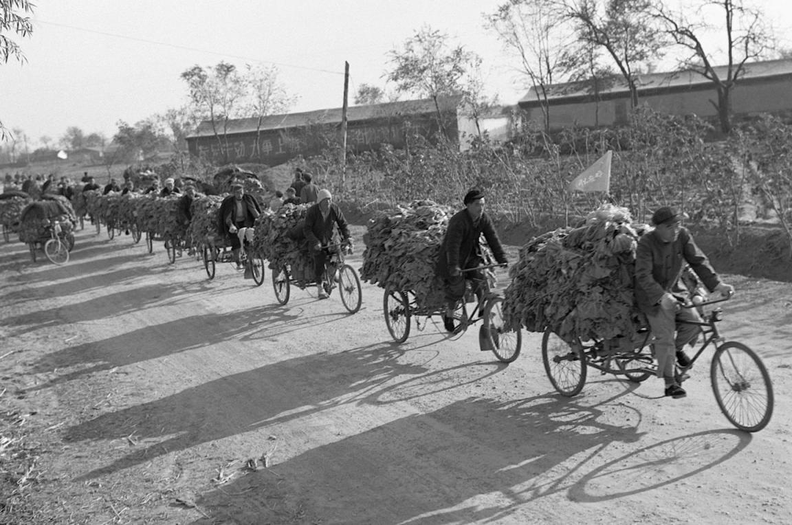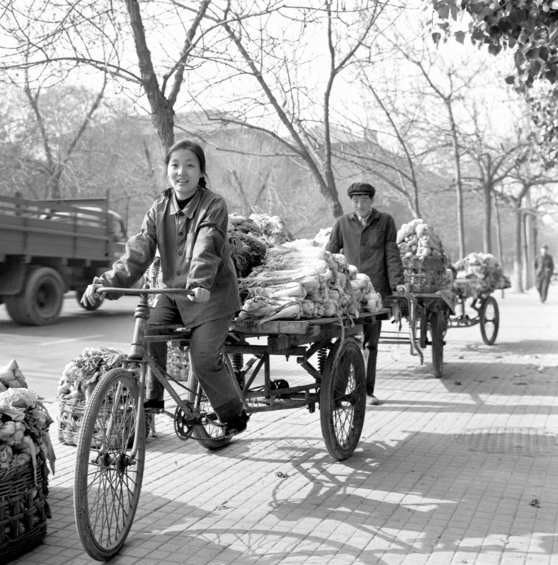 1960年11月拍摄的北京街头运送大白菜的三轮车队。