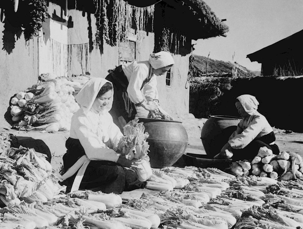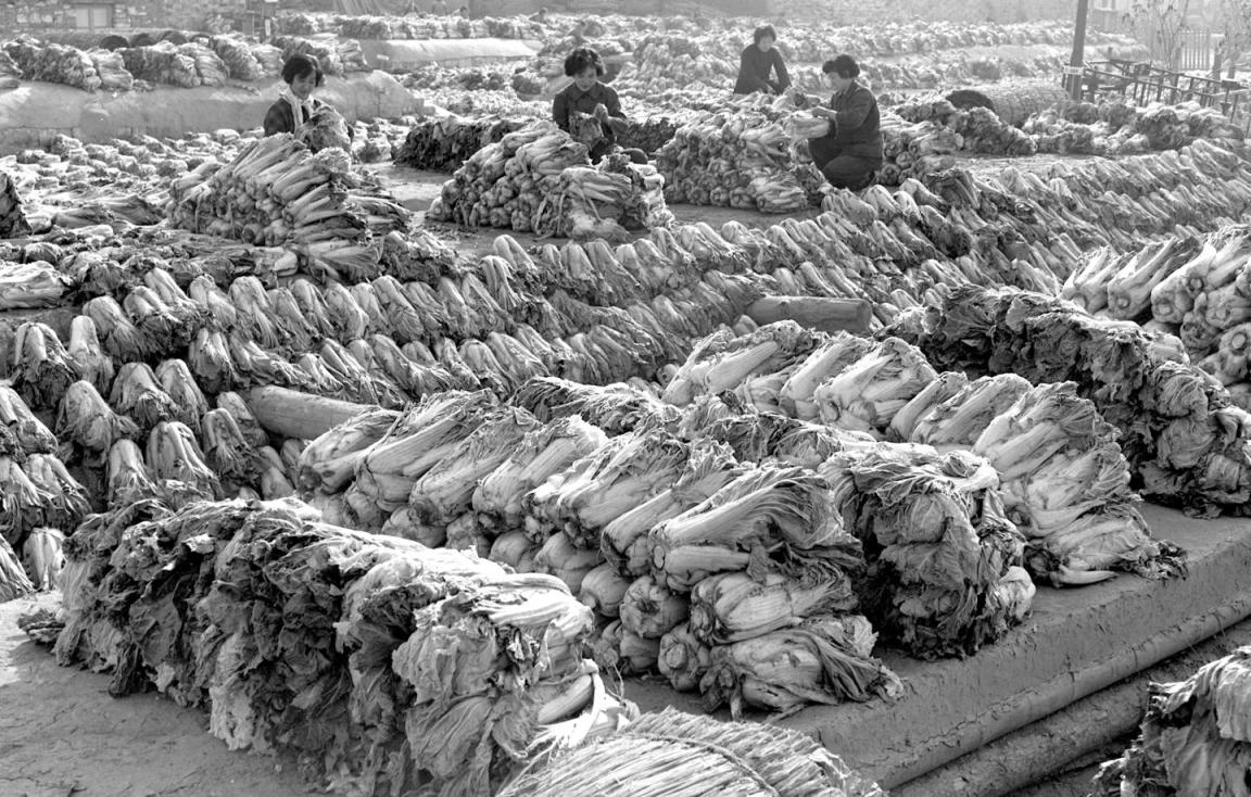 1962年11月,吉林延边汪清县百草沟东说念主民公社社员在腌制白菜。