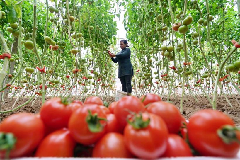 2019年12月6日,河北滦州古马镇小霍庄子村农民在大棚内采收西红柿。