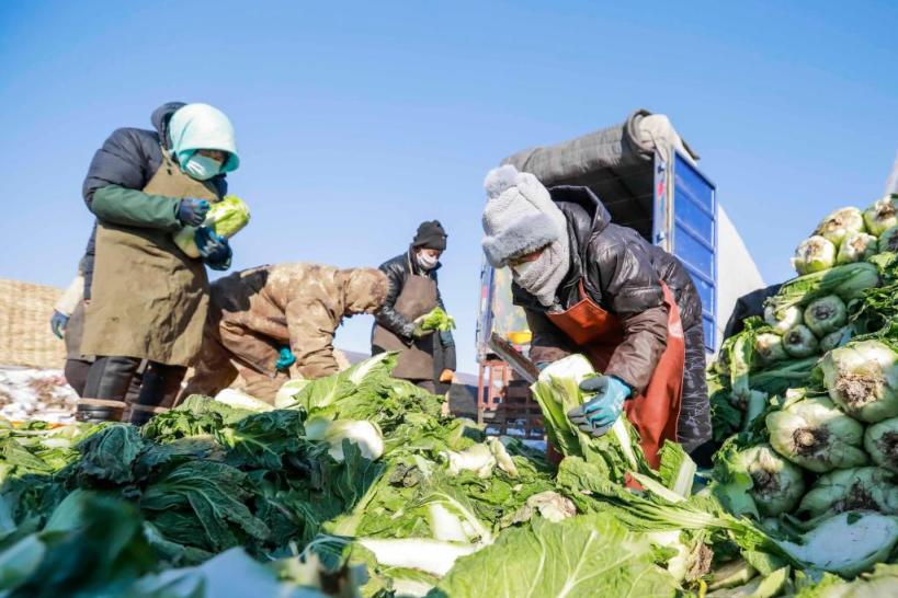 2023年12月20日,河北玉田虹桥镇农民在田间整理冬储大白菜,准备装车外运。