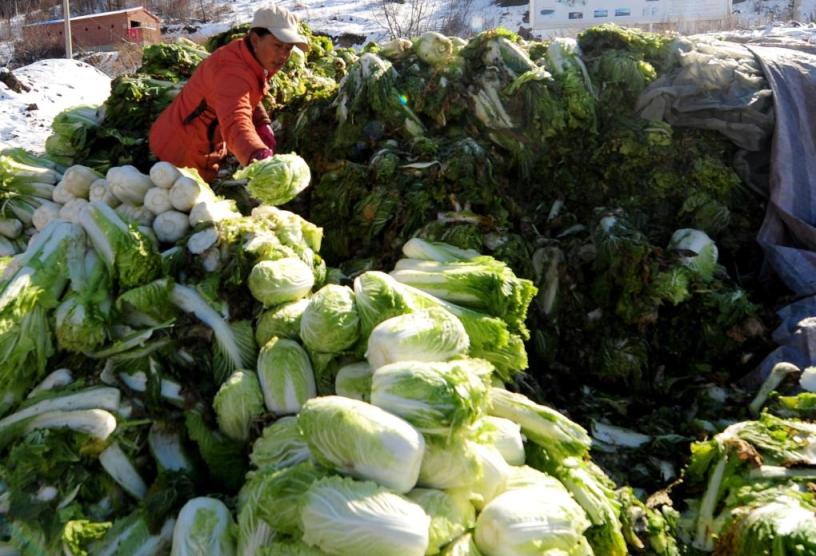 2010年10月20日,一位商贩在内蒙古阿尔山伊尔施镇整理大白菜。